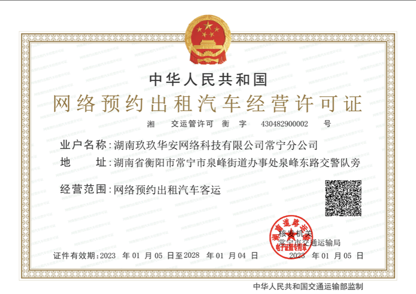 2023年1月5日,玖玖华安取得常宁市网约车牌照,这是玖玖华安在全国网约车市场取得的第72块牌照!