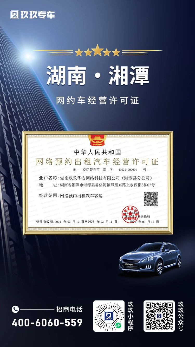 2024年3月12日,玖玖专车成功获批由湘潭县交通主管部门颁发的《网络预约出租汽车经营许可证》。接下来,玖玖专车将配合当地主管部门的各项要求与规定,持续推进网约车合法化进程,为湘潭县广大市民提供安全、便捷、优质的出行服务。