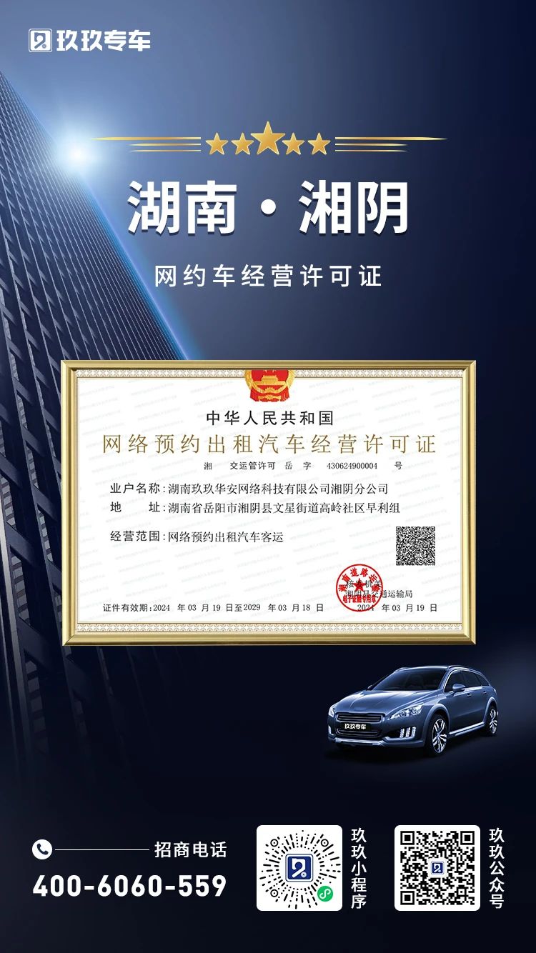 2024年3月19日,玖玖专车成功获批由湘阴县交通主管部门颁发的《网络预约出租汽车经营许可证》。接下来,玖玖专车将配合当地主管部门的各项要求与规定,持续推进网约车合法化进程,为湘阴县广大市民提供安全、便捷、优质的出行服务。